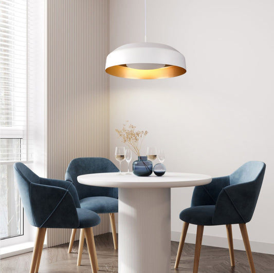 Features a gold-lined reflective shade and a suspended acrylic light column, offering evenly diffused illumination. Experience luxurious and harmonious illumination in any room with this exquisite fixture!